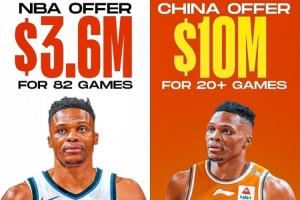 美媒:CBA给威少报价1000万-1400万&只打23场 进季后赛再加钱