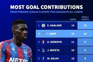 - 2025-11-07英超球员本赛季参与进球榜:哈兰德19球居首,萨尔10球次席