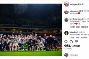 厄德高因伤缺席本场比赛,赛后他在社交媒体上晒出挪威队大合照,庆祝球队出线,配文:“世界杯!”