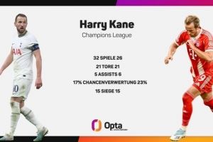 凯恩为拜仁出战26场欧冠打入21球,追平热刺效力期间32场欧冠进球